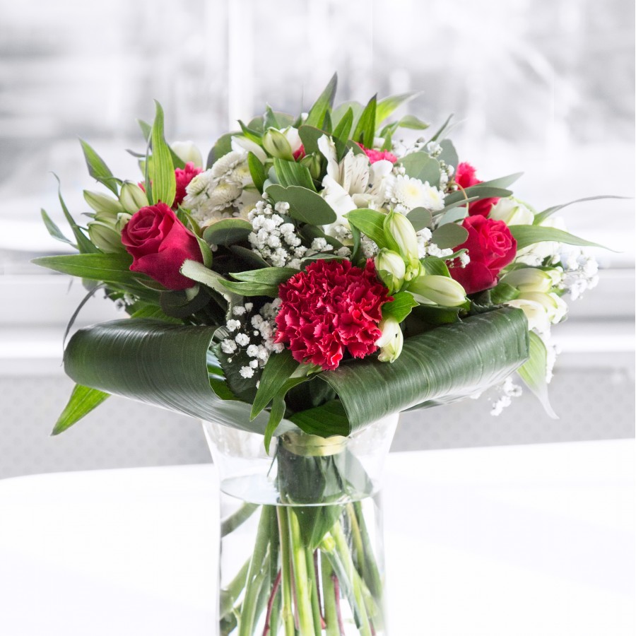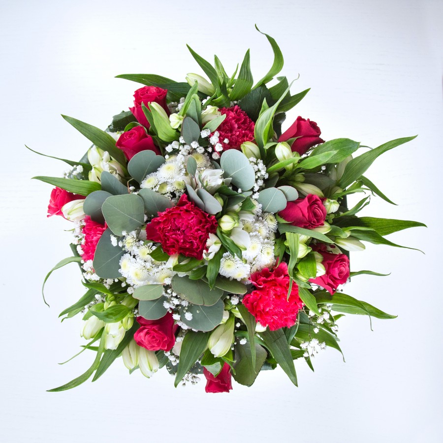 Our Elegant Serenity Floral Arrangement embodies grace and sophistication with a stunning mix of white chrysanthemums, delicate gypsophila, deep red roses, charming carnations, pure white alstroemeria, and lush aspidistra leaves. Each flower is carefully chosen to ensure top-tier freshness and quality.