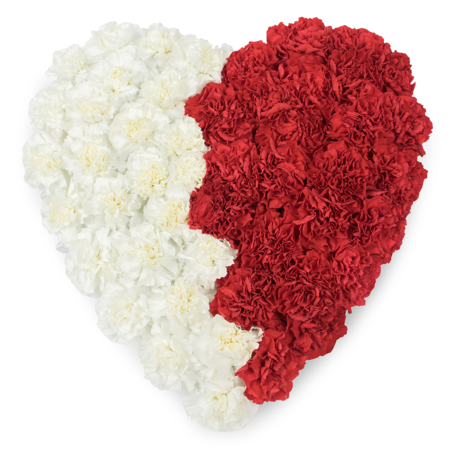 Experience the beauty and uniqueness of our exquisite heart-shaped bouquet, meticulously crafted with white and red carnations. These beloved flowers symbolize deep sympathy and heartfelt emotions, making this arrangement a perfect choice for meaningful occasions.